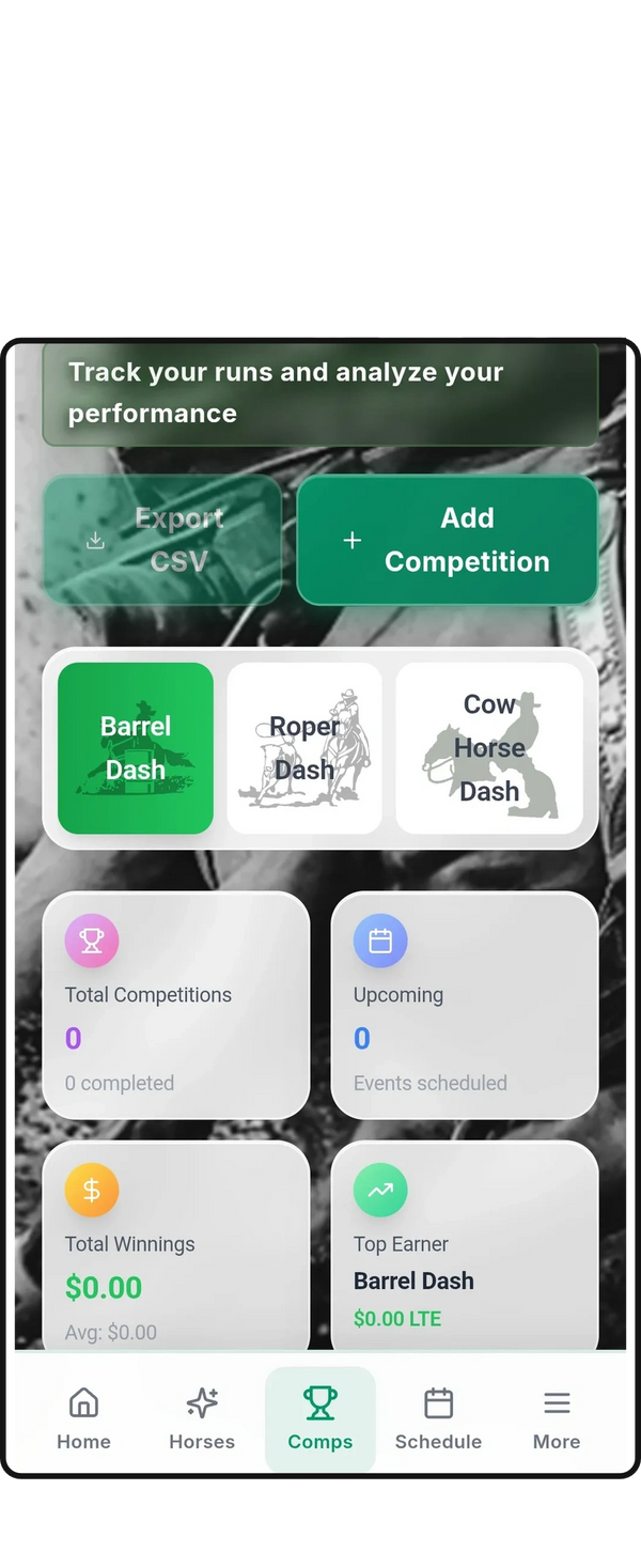Take your Program to the next level with our all-in-one app! Stay organized and up your level by tracking your competitions, stats, earnings, expenses, Fitness, Training, goals, schedule and more—all in one place. Whether you’re at the arena, on your horse, this app keeps you organized so you can focus on what matters most: winning!